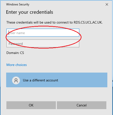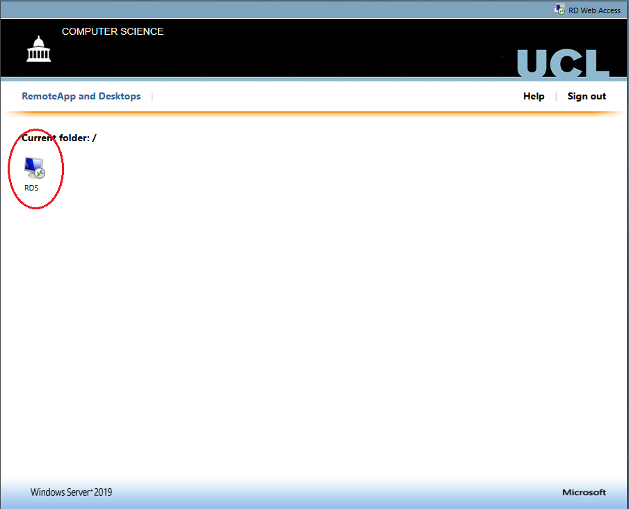 Using Remote Desktop app: enter rds.cs.ucl.ac.uk/RDWeb into your web browser and login with your CS username and password.